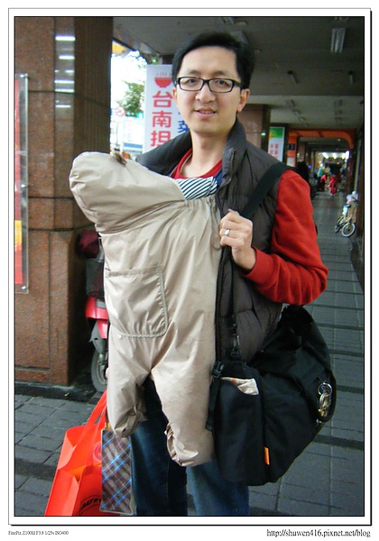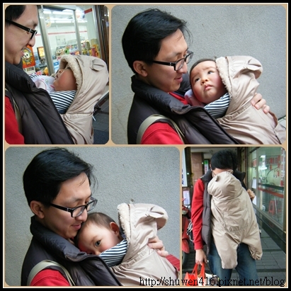 瞧小安安被披風緊緊的包住,雙腳反折設計讓冷風沒機會侵襲,爸比空出來的手還可以拿好多東西XD~