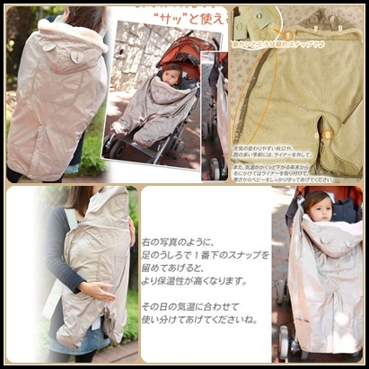 寒風刺骨的冬天來臨,平時帶小安安出門只用combi SK-4揹帶的我,發覺應該幫她物色一件防風防雨且保暖的披風,婆婆建議可以找像古早時期用的小棉被或揹巾,但遇到下雨難免會淋濕,尋尋覓覓了好久,又適逢寒流來襲,只好暫且使用大人穿的羽絨外套將小安安包裹住,不過麻煩之處就是出門得帶兩件大外套,一件自己穿一件幫小安安遮風擋雨,實在不便。