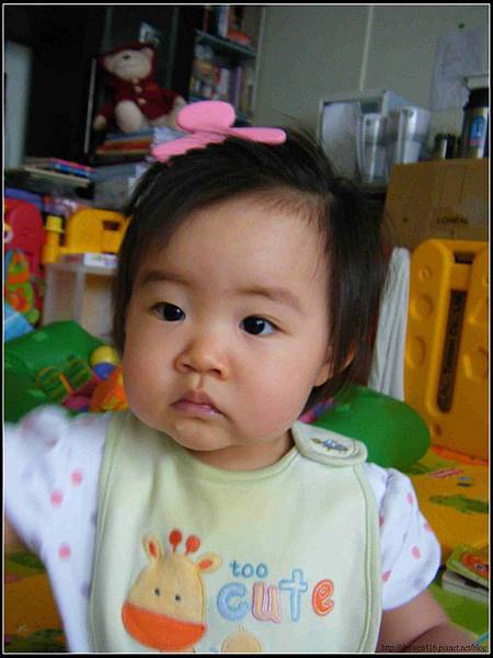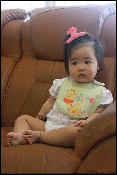 最近天氣燥熱,夏天已然來臨,平時為了怕她滿頭旺盛的頭髮太熱,幫小安安用漂亮的髮夾將頭髮夾起,但她總愛將髮夾扯下來,就算滿頭大汗也不在乎,一回看著媽咪在家用老虎夾夾起頭髮,她不停用手比劃著指指點點,順手拿著一個老虎夾往小安安頭上一夾,這小妮子竟然乖乖的讓老虎夾待在頭上,就算動來動去老虎夾都快掉下來,也會趕緊爬到媽咪身旁要我再幫她夾好,是說什麼都要跟媽咪一樣就是了。噗~這裝扮還蠻像道地的灰姑娘呀~XD