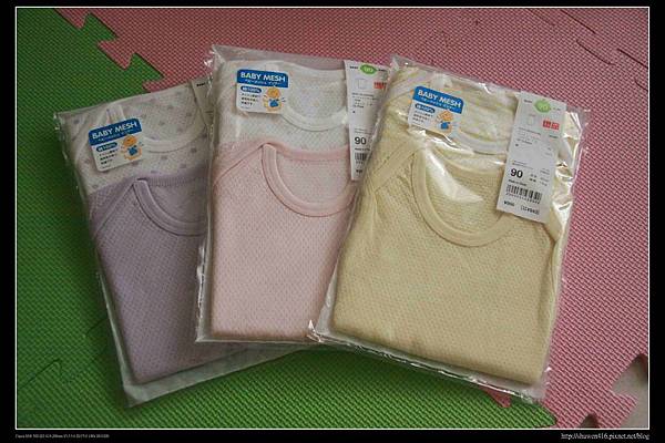 滿頭多髮的小安安非常怕熱,只要室溫高於26度,馬上汗流浹背,平時在家穿的mon and bab短袖肩扣款包屁衣雖然是純棉,但對於小安安來說似乎還真有點厚,常常得幫她在背部多塞一條紗布巾吸汗,雖然也買了細肩帶的包屁衣或是無袖上衣,但在冷氣房裡還是穿個有袖的比較安心,搜尋了許久,看了PTT媽寶板大家對UNIQLO的洞洞包屁衣一致好評,趁著特價期馬上請日本代購買了三組回來。