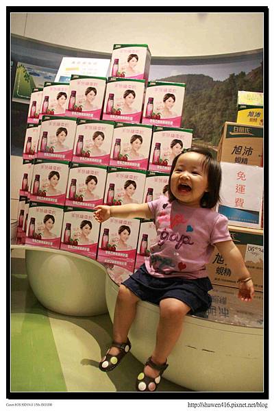 接著到達緞帶王對面的白蘭氏健康博物館參觀,可以深入瞭解白蘭氏的歷史與雞精的製作過程,還有一些有趣的小遊戲與測驗,另外還販售許多白蘭氏的周邊商品。當奶奶和爸比在忙著訂購雞精等商品,小安安自己則開始逛大街,看到認識的熊也要衝上前指一下,小翻牌也翻翻看,最後還在商品山前拍張照。參觀完白蘭氏時間已四點半,考量到小安安的吃飯時間與住宿地的車程,揮別了彰化朝臺中前進。
