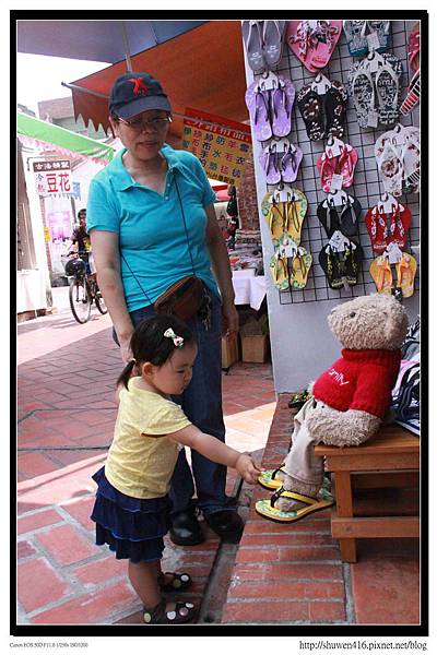 鹿港老街的一切都讓小安安覺得新奇,看到店家擺出的小熊穿上托鞋,忍不住上前摸摸。