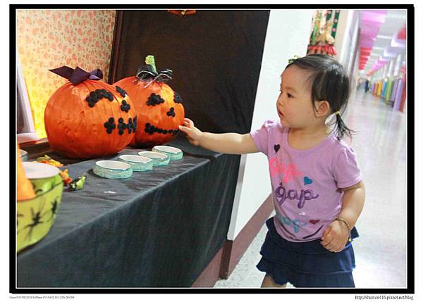 萬聖節快到了,現場販售生產許多萬聖節緞帶,也用緞帶作了兩顆南瓜笑臉,小安安好奇的伸手摸一摸。