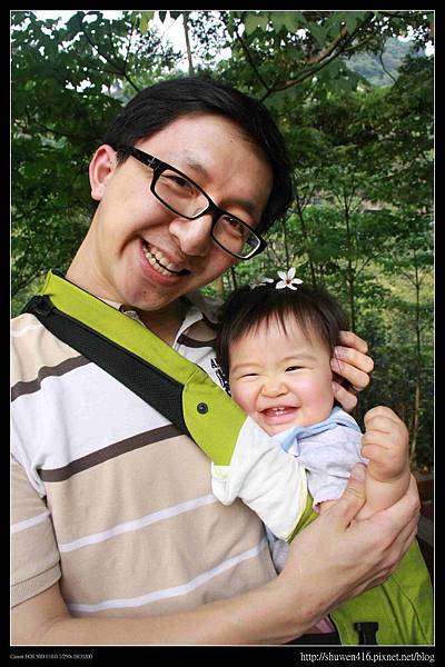 背著小安安步行賞油桐花,父女倆笑得好開心唷!