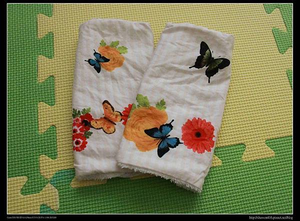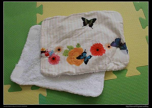 款式選擇蝴蝶與花朵,內裡還是採用毛巾布,搭配在青草綠的揹帶上真是再適合不過了。