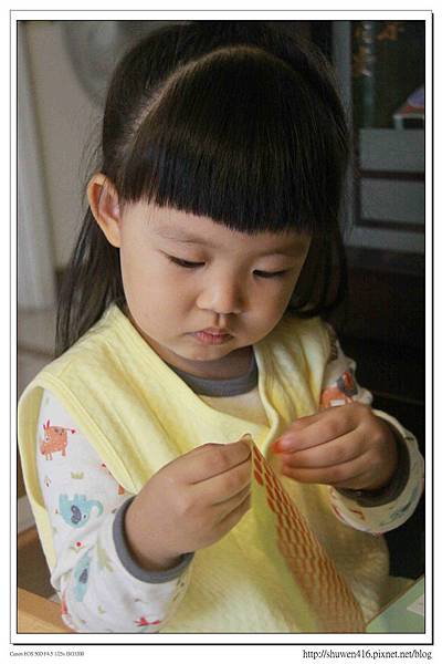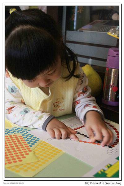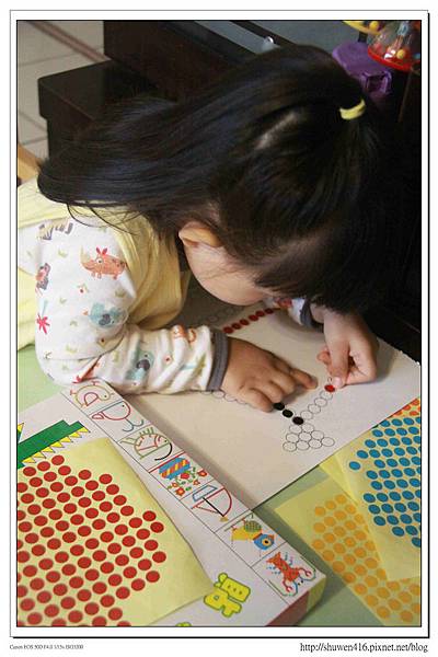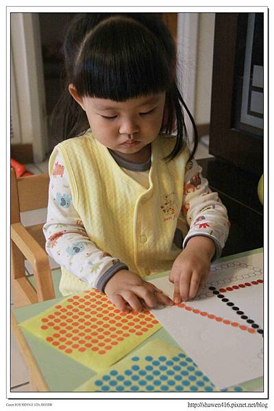 後來藉由媽咪提點的小技巧,雙手輔助黏貼,越來越能準確的將小貼紙黏在固定的位置了。