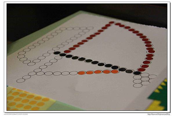 小心翼翼的將圓形貼紙一個個貼到圓框裡。