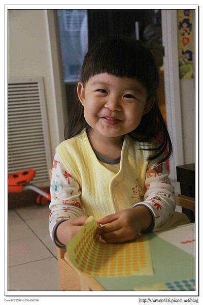 儘量要求小安安將貼紙貼在圓框內,此舉更能訓練她的專注力呦!
