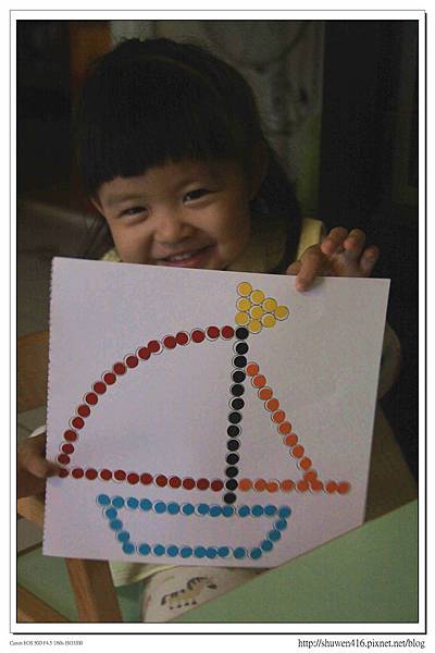 小安安拿著自己完成的帆船貼紙拼圖,好得意耶!