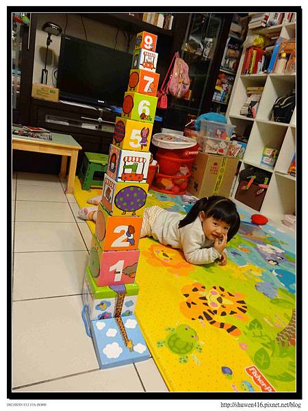 已能清楚分辨大小、長短,能夠自己將積木盒由大至小疊高高,學習力有著長足的進展,很多生活瑣事只需教她幾遍就能很快的學起來,對於生活常規仍有著自身的規範。