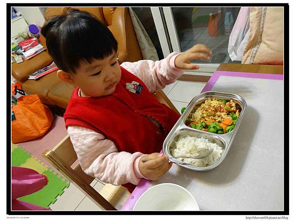 幫小安安換了飯盒,吃飯時將飯菜分別擺放,看的清楚今日菜色,更有興趣動手自己吃飯,食量約莫是半碗白飯加上半碗菜肉,餐後再來半碗湯,水餃一次也能嗑掉七顆。每餐限時40分鐘完食即能得到乖寶寶貼紙,集滿31張即能兌換玩具、書本或是到信誼玩,因此小安安每餐都會很努力將飯菜吃光光。
