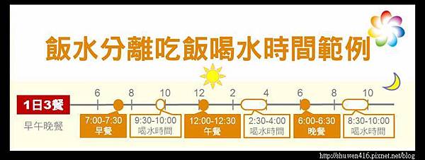 飯水分離轉言之就是吃飯時乾濕分離,吃飯時不喝湯水、飲料,只吃乾食,就算有湯也只撈湯料吃,待飯後兩小時才喝湯水,飯前1~2小時也不喝水,水果因水分多,故要吃就留在喝水時間再食用,早餐也以乾食為主,晚上10點後就不再喝水,夜半若是渴了可以漱口或是吃烤餅。